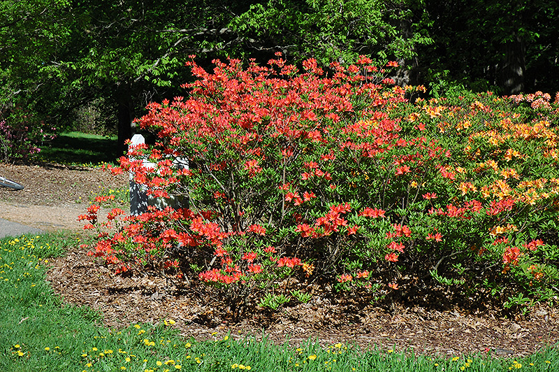 A hardy deciduous azalea, covered in deep orange flowers in spring before the leaves, tall upright habit and good fall color; absolutely must have well-drained, highly acidic and organic soil, use plenty of peat moss when planting