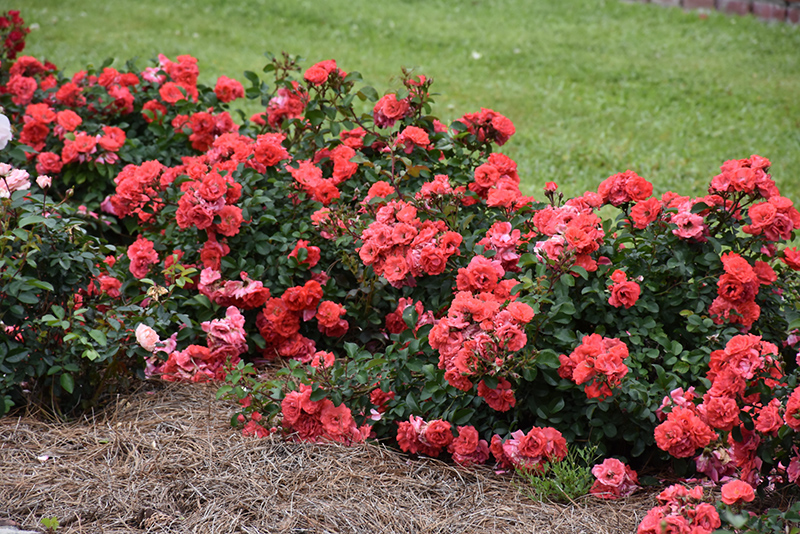 A cross between groundcover and miniature roses; stunning coral-red blooms repeat vigorously all season; highly pest and disease resistant; excellent for smaller gardens or along walkways