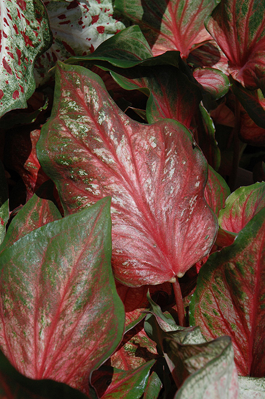 Pink Gem Caladium's attractive pointy leaves remain pink in color with distinctive crimson veins and tinges of forest green throughout the season on a plant with a mounded habit of growth.