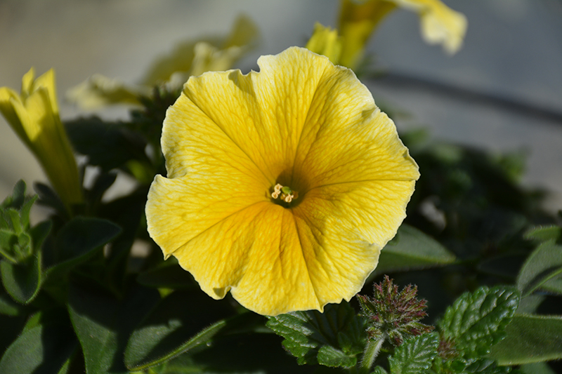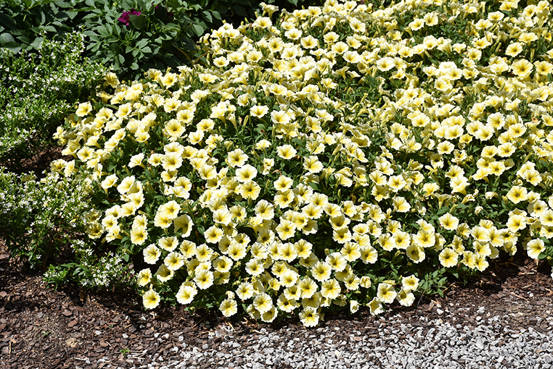 Bee's Knees Petunia is smothered in stunning buttery yellow trumpet-shaped flowers with yellow centers at the ends of the stems from mid spring to early fall. Its pointy leaves remain dark green in color throughout the season.