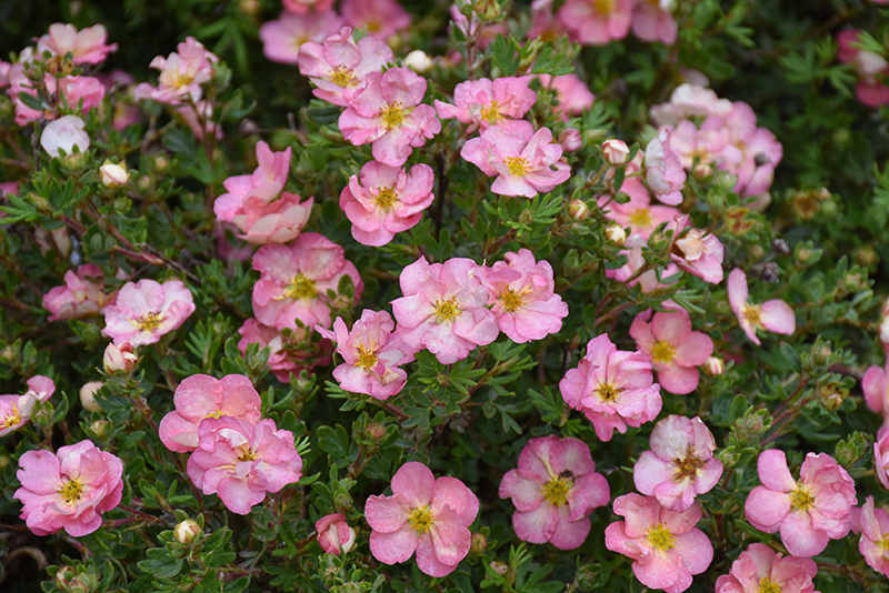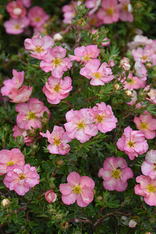 Happy Face Hearts® Potentilla has pink flowers with rose overtones, chartreuse eyes and white centers at the ends of the branches from late spring to mid fall, which emerge from distinctive red flower buds. It has dark green deciduous foliage. The small fuzzy ferny compound leaves do not develop any appreciable fall color.