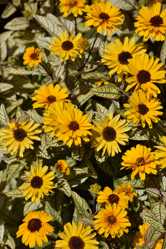 Touch Of Blush False Sunflower has masses of beautiful semi-double gold daisy flowers with yellow overtones and coppery-bronze eyes at the ends of the stems from mid to late summer, which are most effective when planted in groupings. The flowers are excellent for cutting. Its attractive serrated pointy leaves remain creamy white in color with distinctive dark green veins and tinges of shell pink throughout the season.