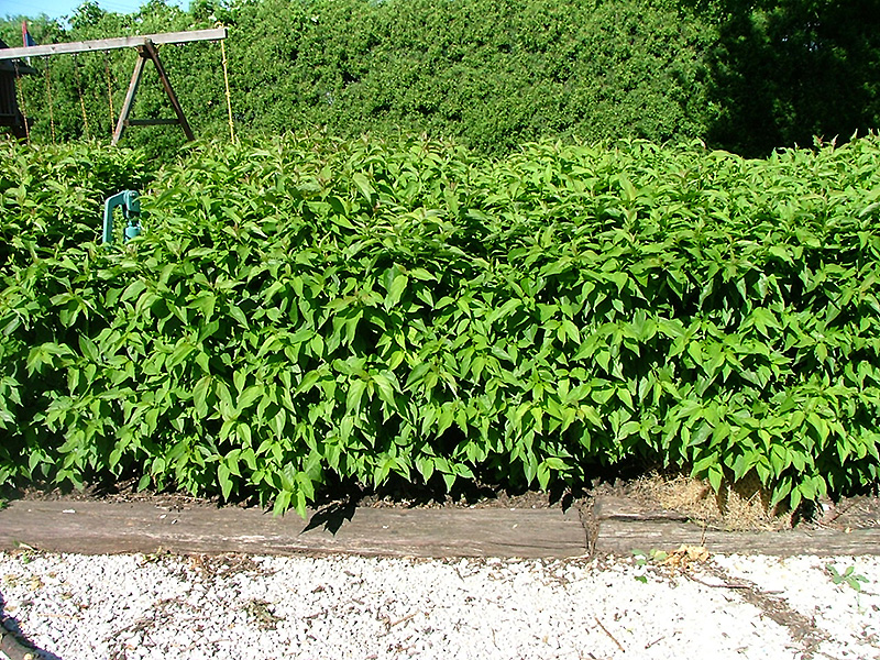 Huron Gray Dogwood will grow to be about 4 feet tall at maturity, with a spread of 4 feet. It tends to fill out right to the ground and therefore doesn't necessarily require facer plants in front. It grows at a slow rate, and under ideal conditions can be expected to live for 40 years or more.