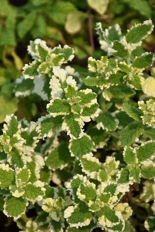 Variegated Pineapple Mint features bold spikes of white flowers rising above the foliage in mid summer. Its attractive fragrant pointy leaves remain green in color with distinctive creamy white edges throughout the season.
